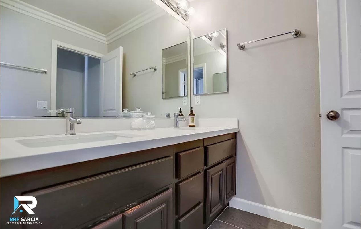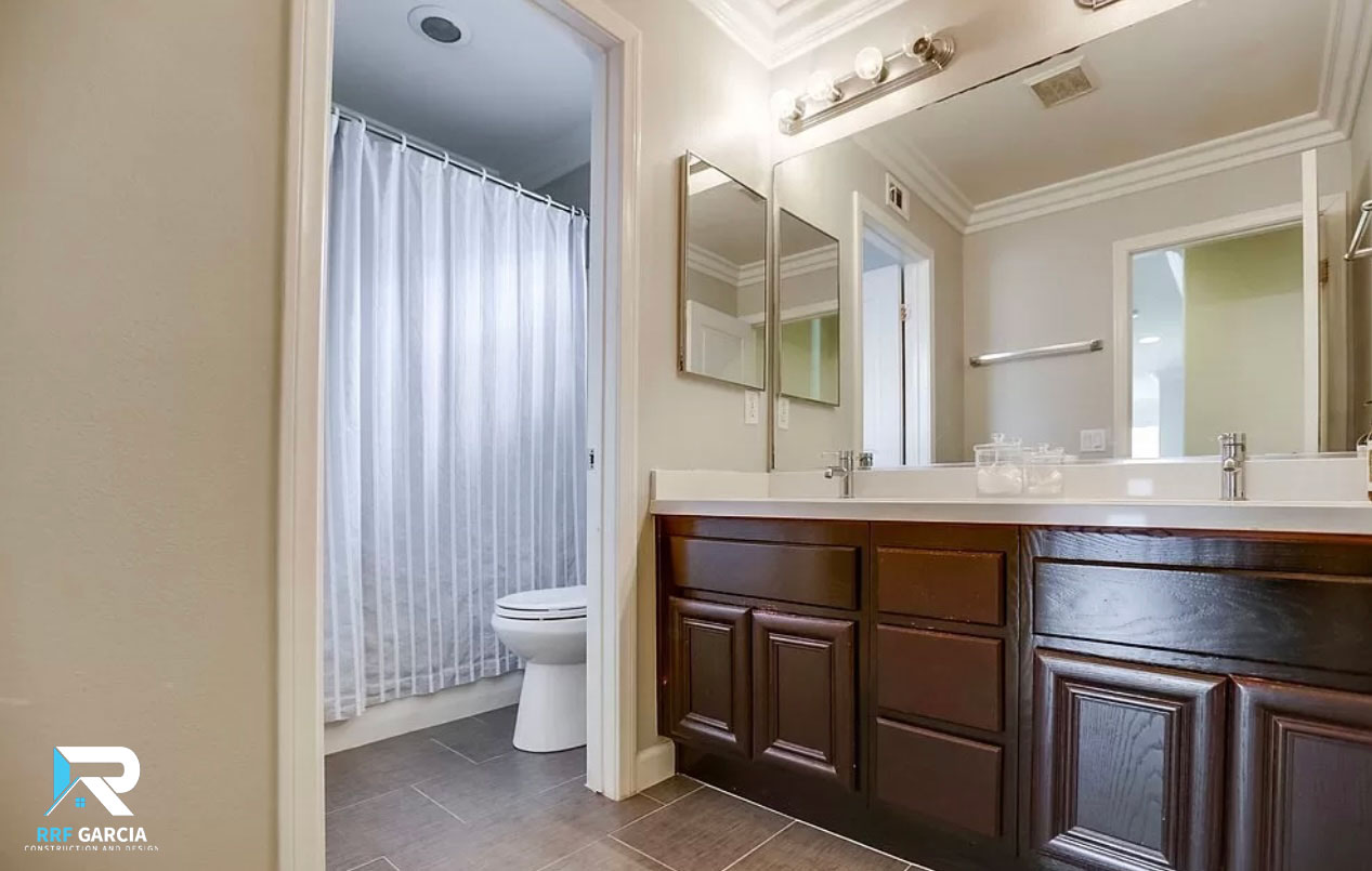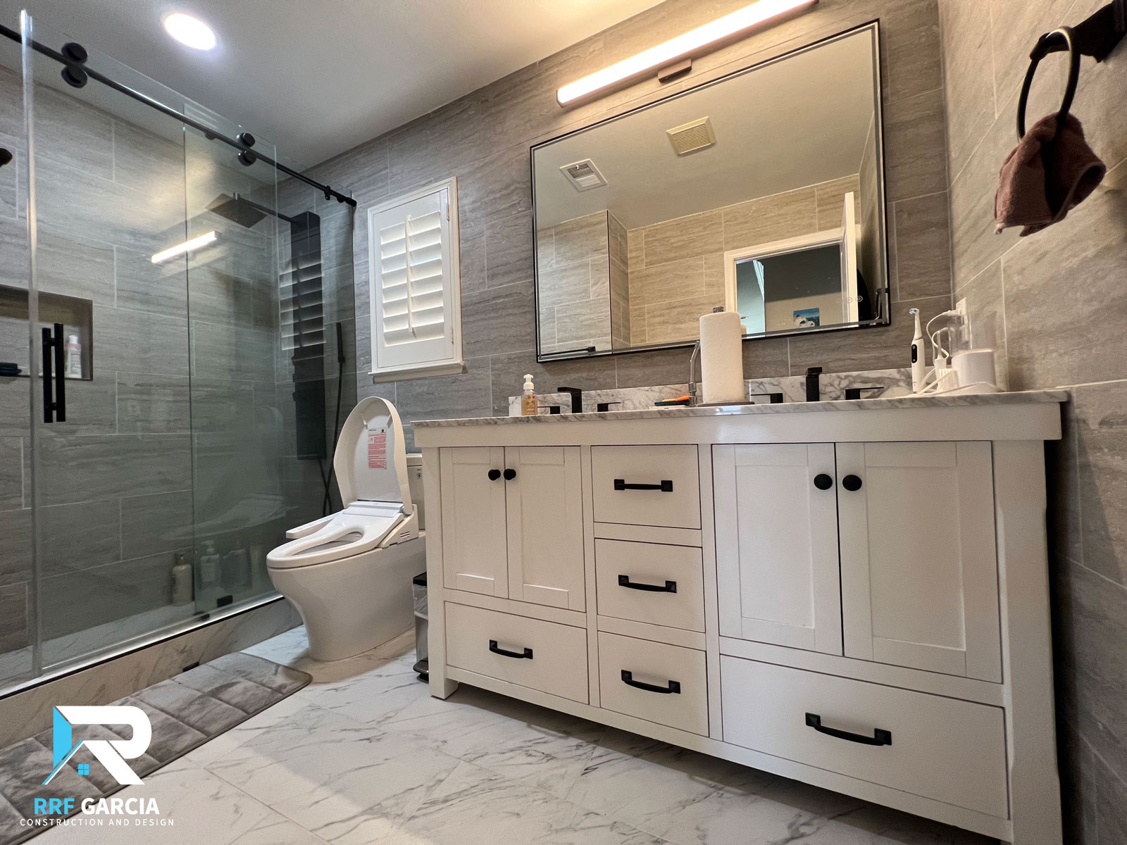 This dated design has a potential for a surprising remodel. The walls feel like they are closing in on this bathroom. Even though there is plenty of light pouring in, this lackluster space is ready for an upgrade. As the floor space opens up, this room was given a whole new look with a glamourous vibe. The bathroom becomes brighter, fresh, spacious and modern.