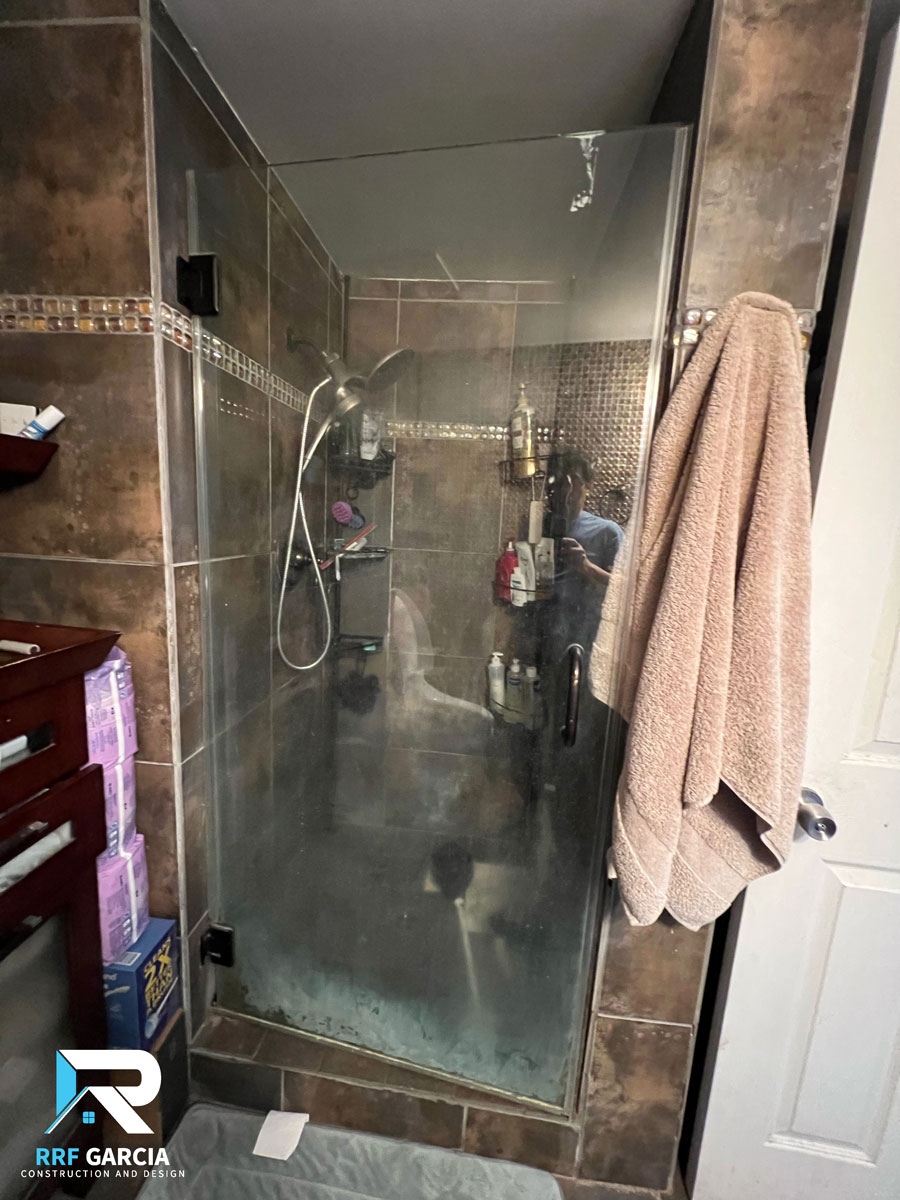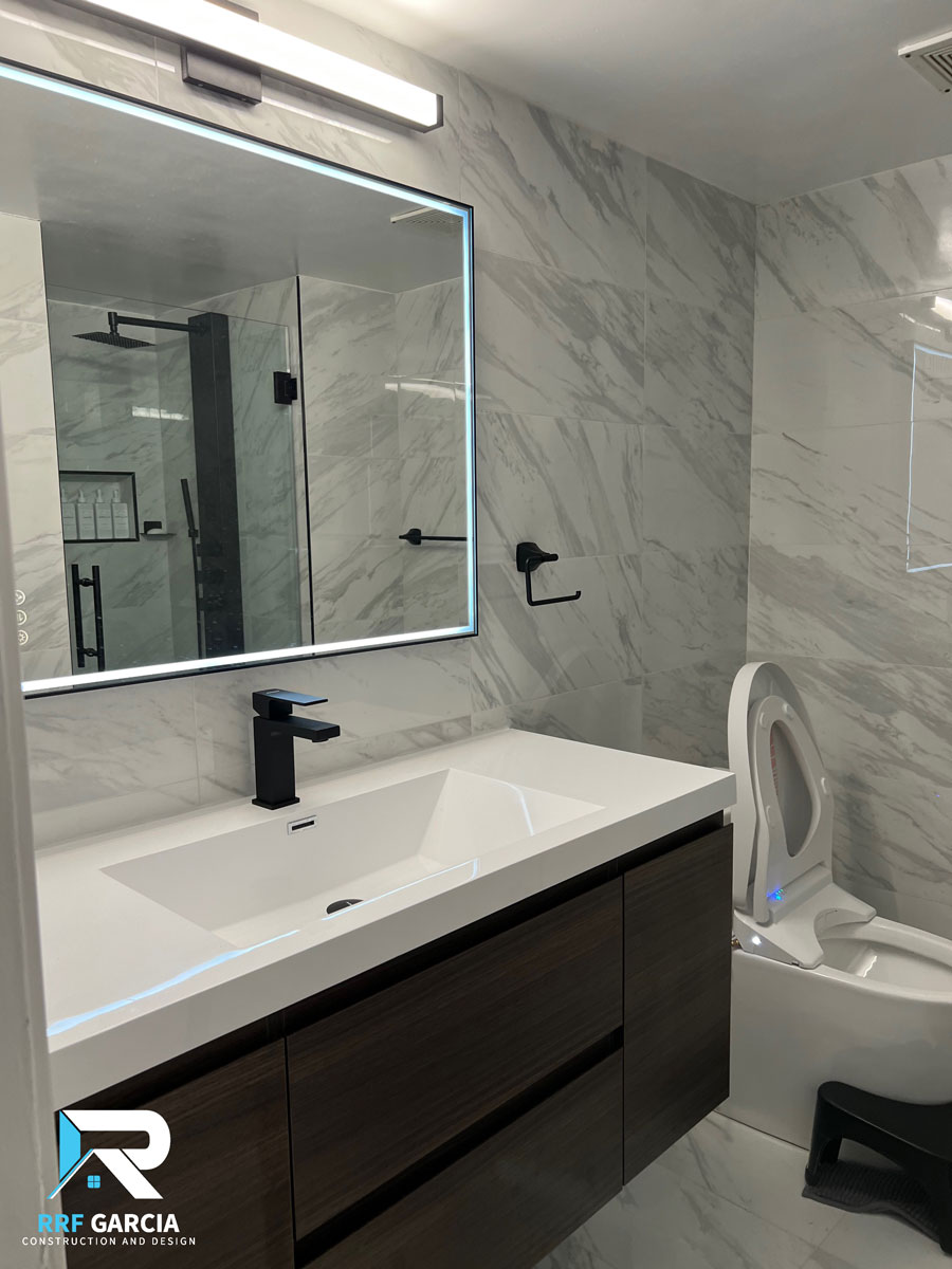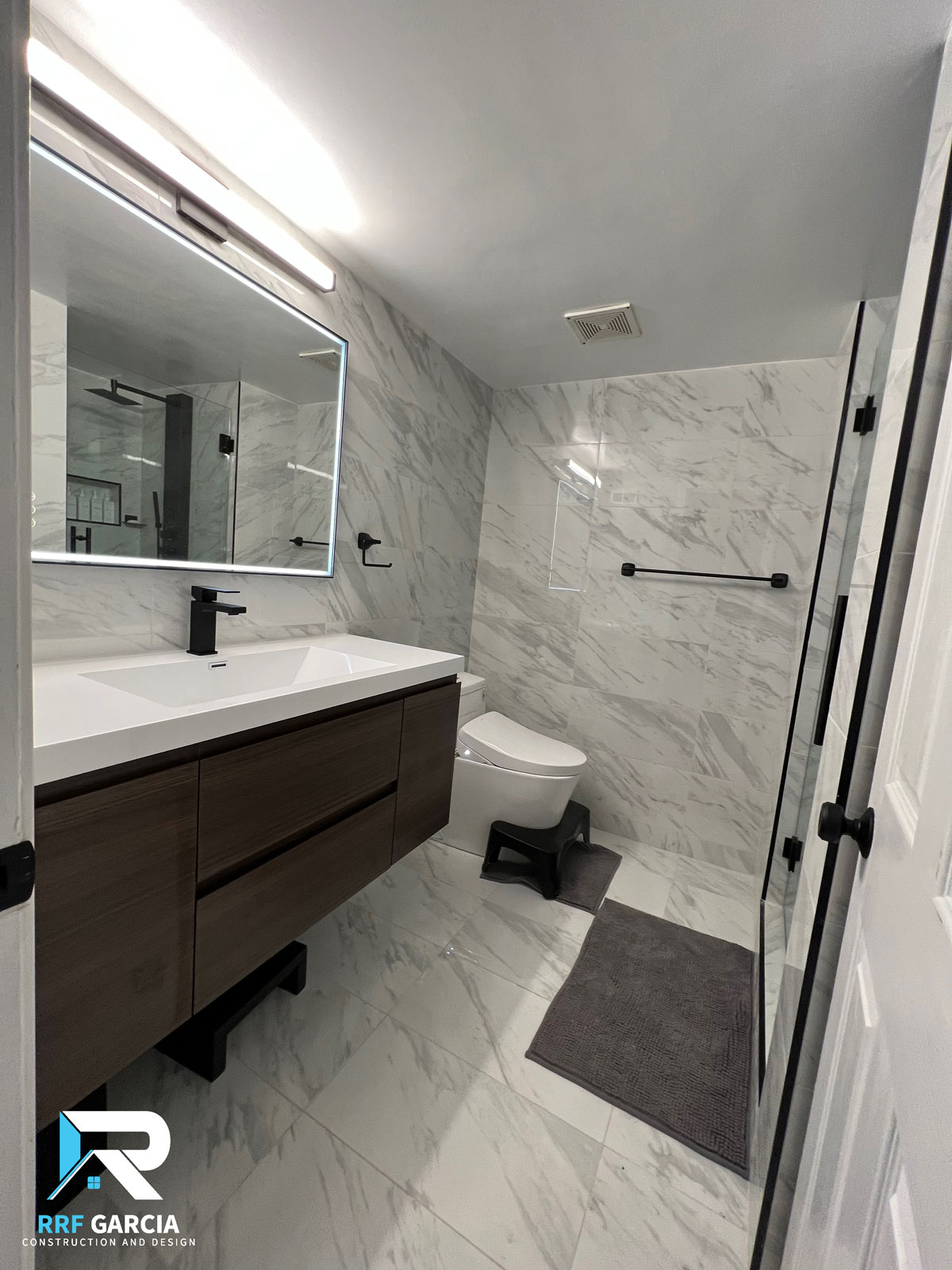 Contractor Renato Garcia designed the floor plan with a new layout making this once dark, cramped, cluttered bathroom into a bright, open and modern space.