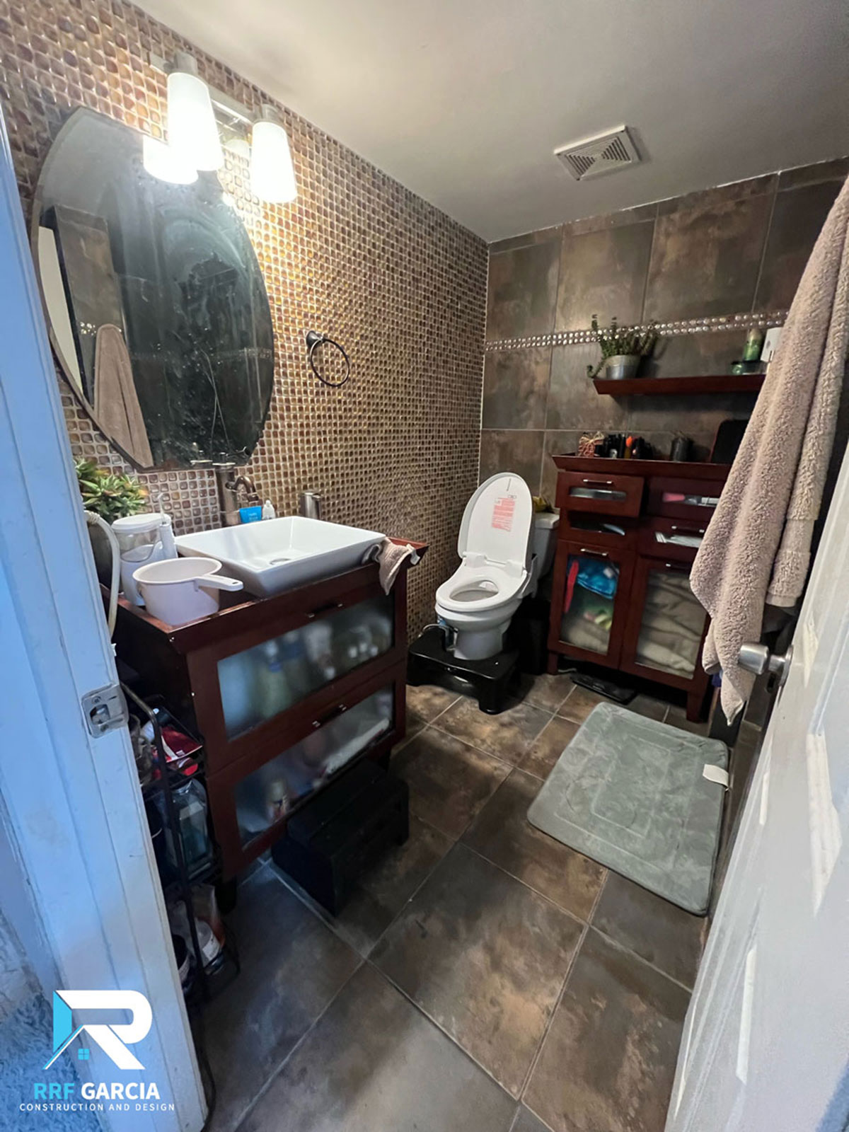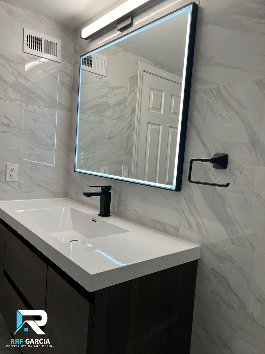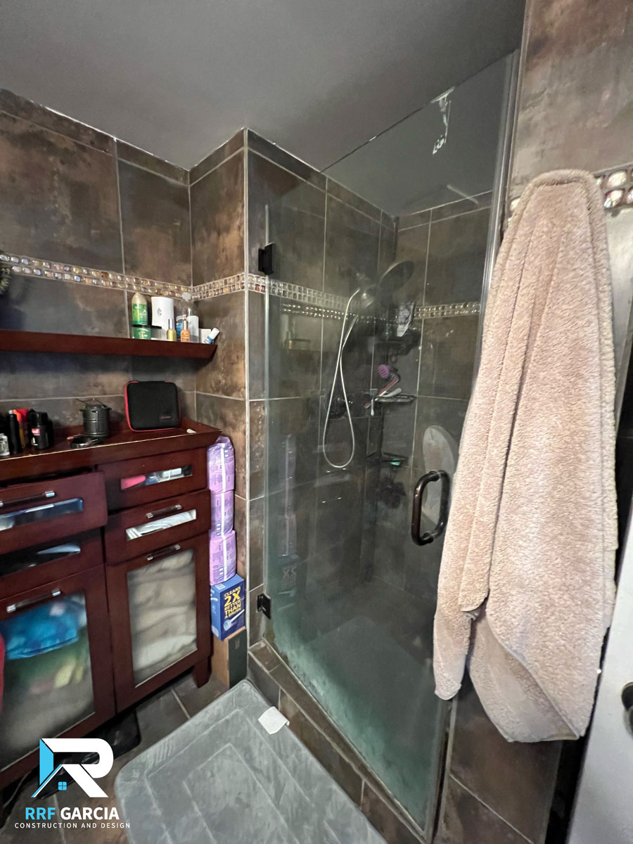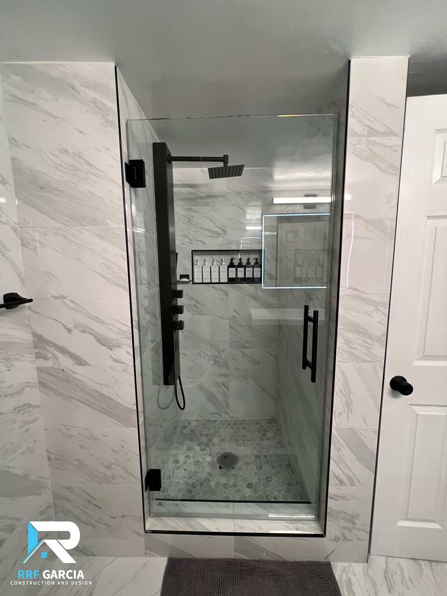 Contractor Renato Garcia designed the floor plan with a new layout making this once dark, cramped, cluttered bathroom into a bright, open and modern space.