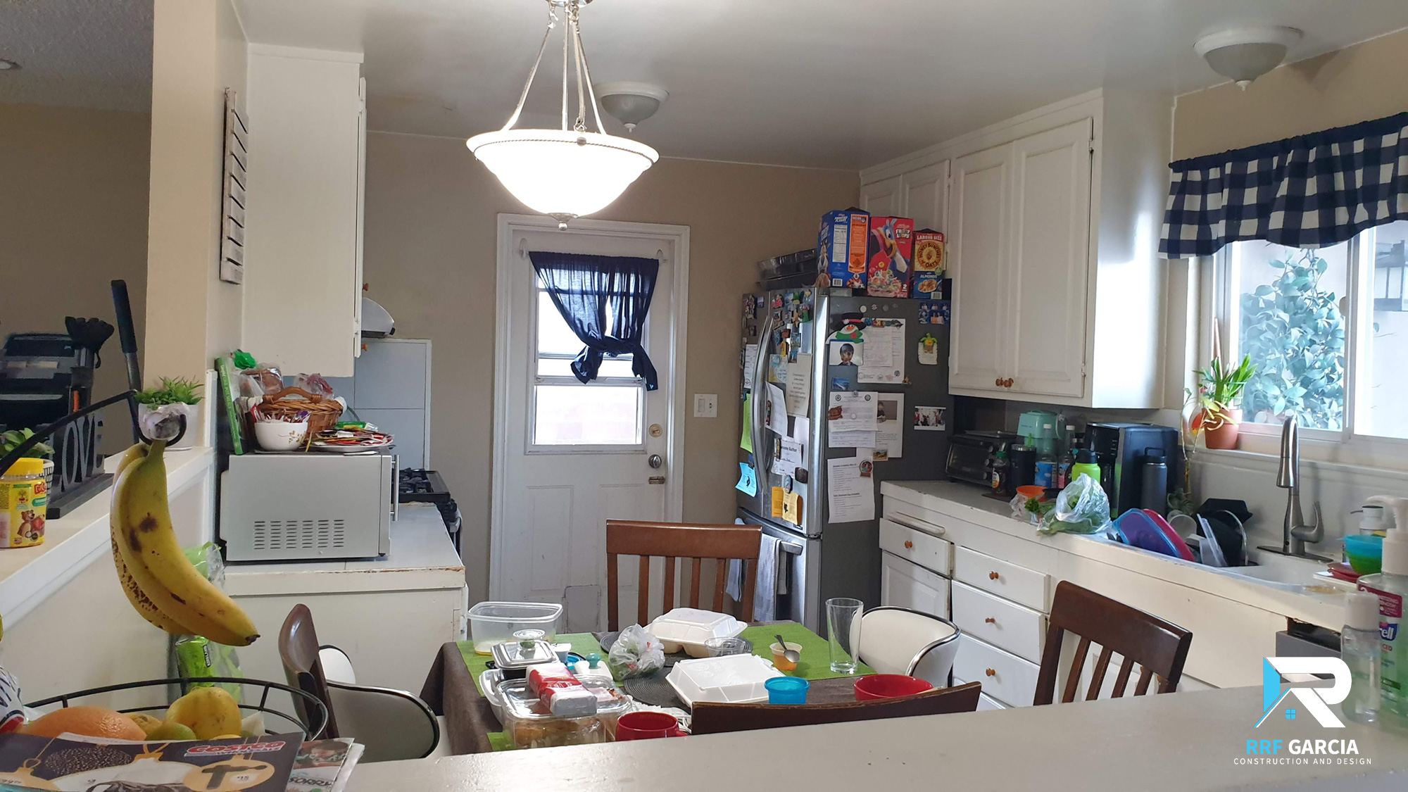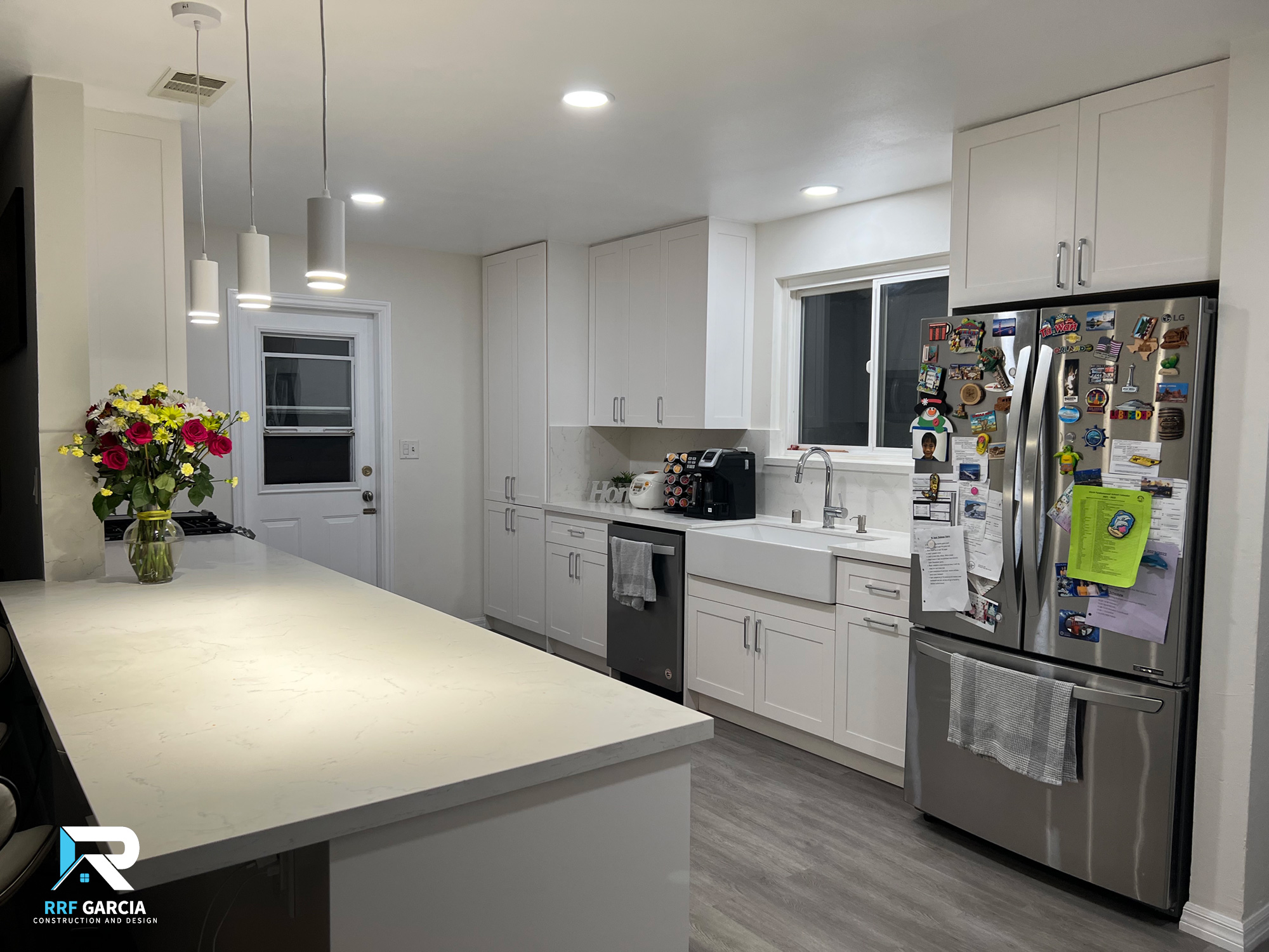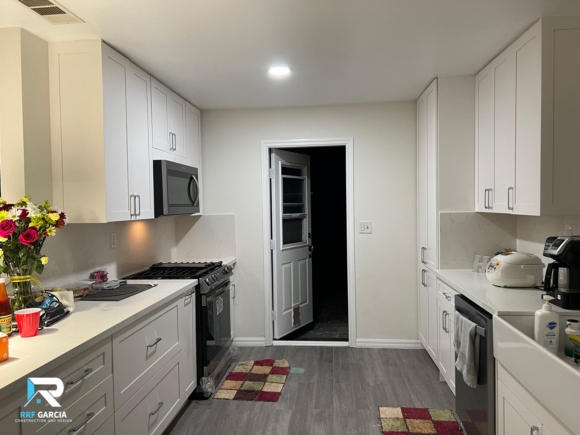 Tear down the kitchen partition walls and replaced it with 8 feet island with quartz countertop and full backsplash. Placement of the refrigerator, stove, island and countertop made the appearance of the entire kitchen modern, airy and spacious. Replaced the undermount/drop-in kitchen sink with 36” single bowl farmhouse apron front fireclay kitchen sink. Pendant lights were installed on the island for added lighting. Kitchen floors were replaced for an upgraded look.