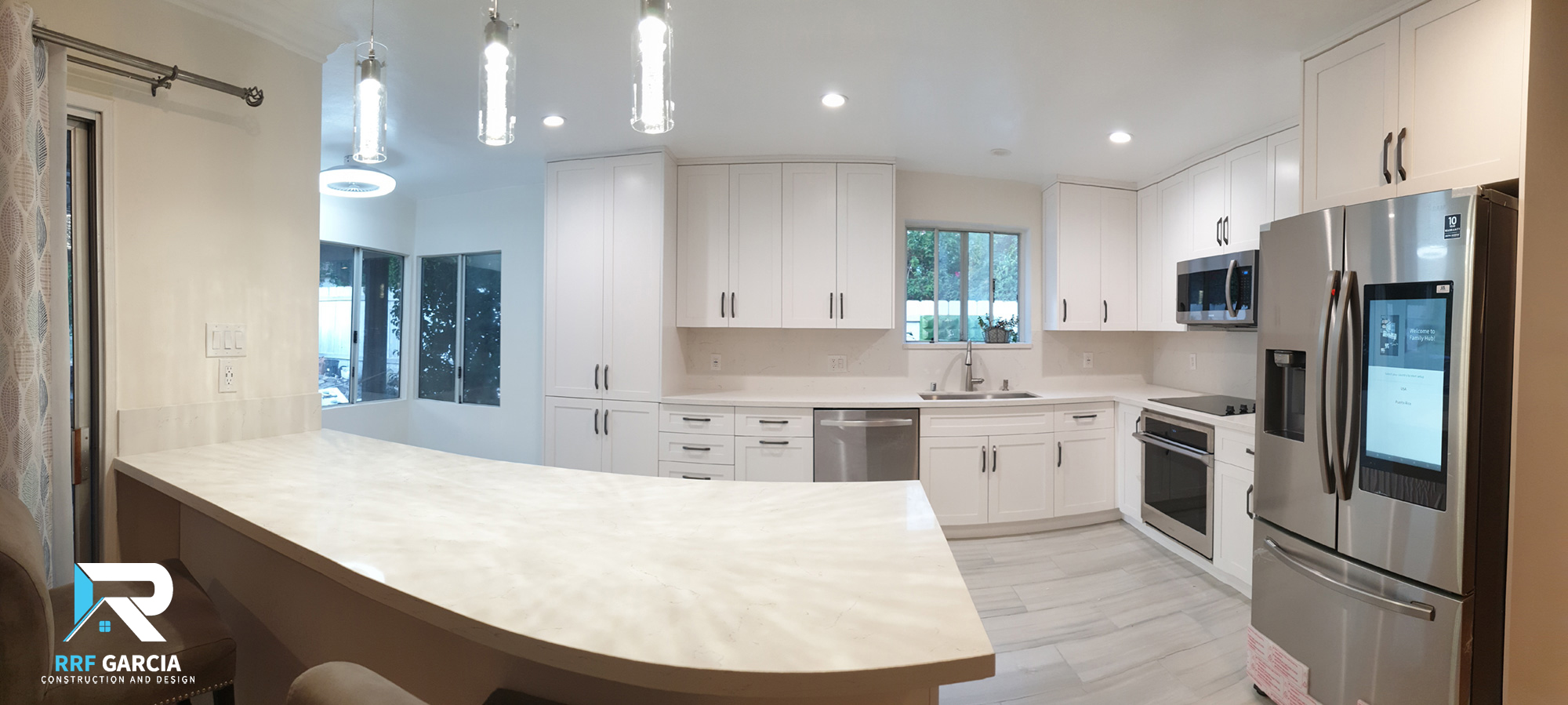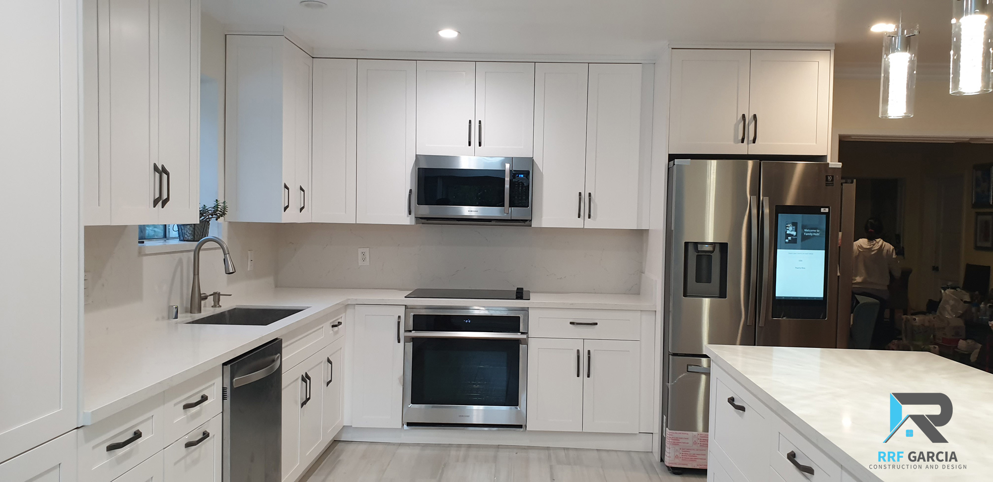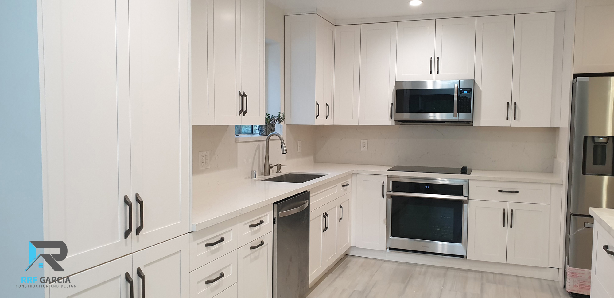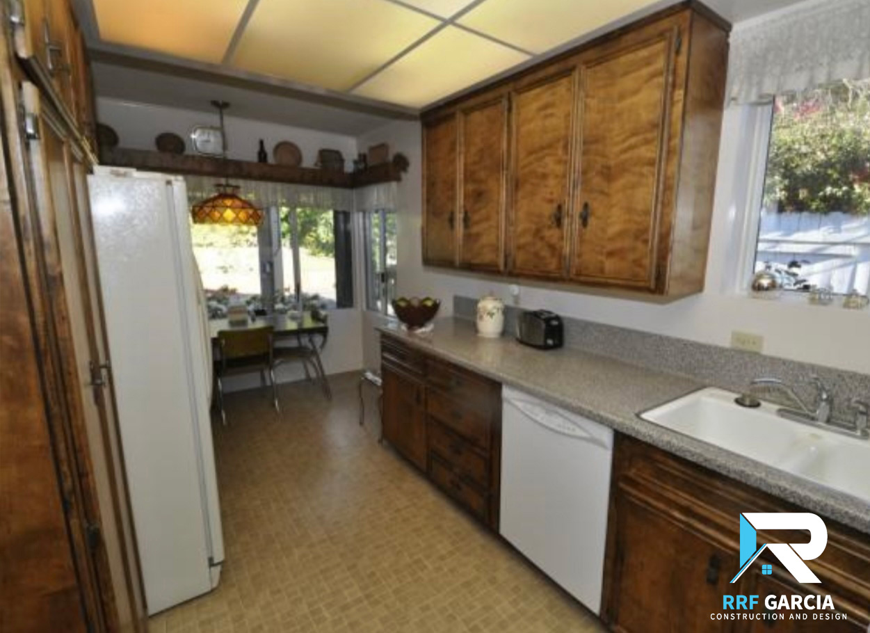 This dated kitchen lacked style and function. RRF Garcia Construction & Design enhanced the look by tearing down the partition wall to make the kitchen look modern, brighter, airy and functional. Roll out and soft close cabinets and drawers were installed on the entire kitchen cabinets and island for extra storage. The kitchen island also introduces extra seating and useable space. Removed top-mount two-hole sink and replaced it with undermount 16-gauge stainless steel kitchen sink. Pendant lights were installed on the island for added lighting. USB ports and additional electric outlets were installed on the island for gadgets. For an upgraded look ceramic tiles were installed on the kitchen floors.